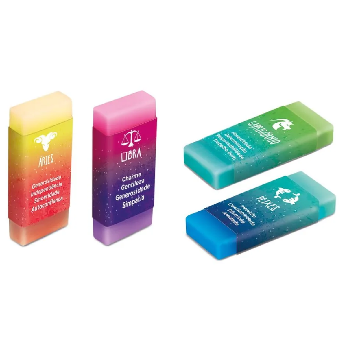 Com os 12 signos do zodíaco e suas cartacterísticas, a borracha Signos é ECO PVC: Não tóxica, em uma borracha de textura SUPER macia e tecnologia DUST FREE que deixa menos resíduos. Ideal para lápis, grafite e lapiseira.
